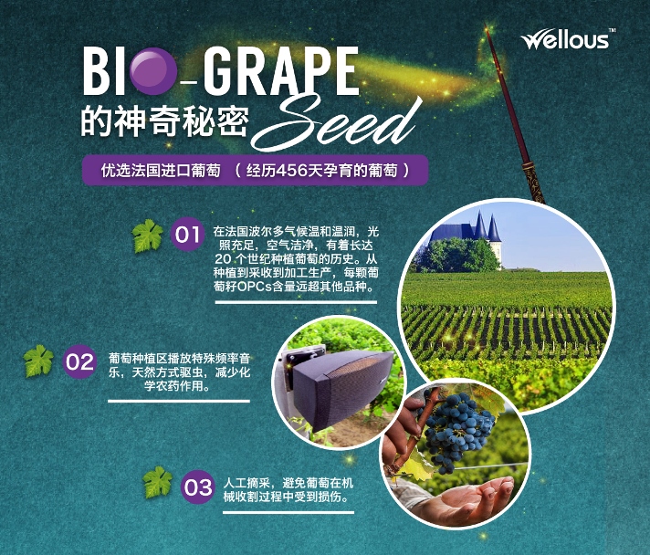 Bio-Grape Seed (Bio-葡萄籽)是一种含标准提取95% 强效抗氧化剂——“原花青素 (OPCs) 的葡萄籽提取物抗氧化配方。 葡萄籽提取物是丰富OPCs的天然来源,可以作为自由基清除剂来保护身体免受细胞损伤的高效抗氧化剂。葡萄籽提取物的研究始于“法兰西奇迹”(French Paradox) 这个健康概论,进一步的研究表示,红葡萄酒中的原花青素 (OPCs) 能促进健康。