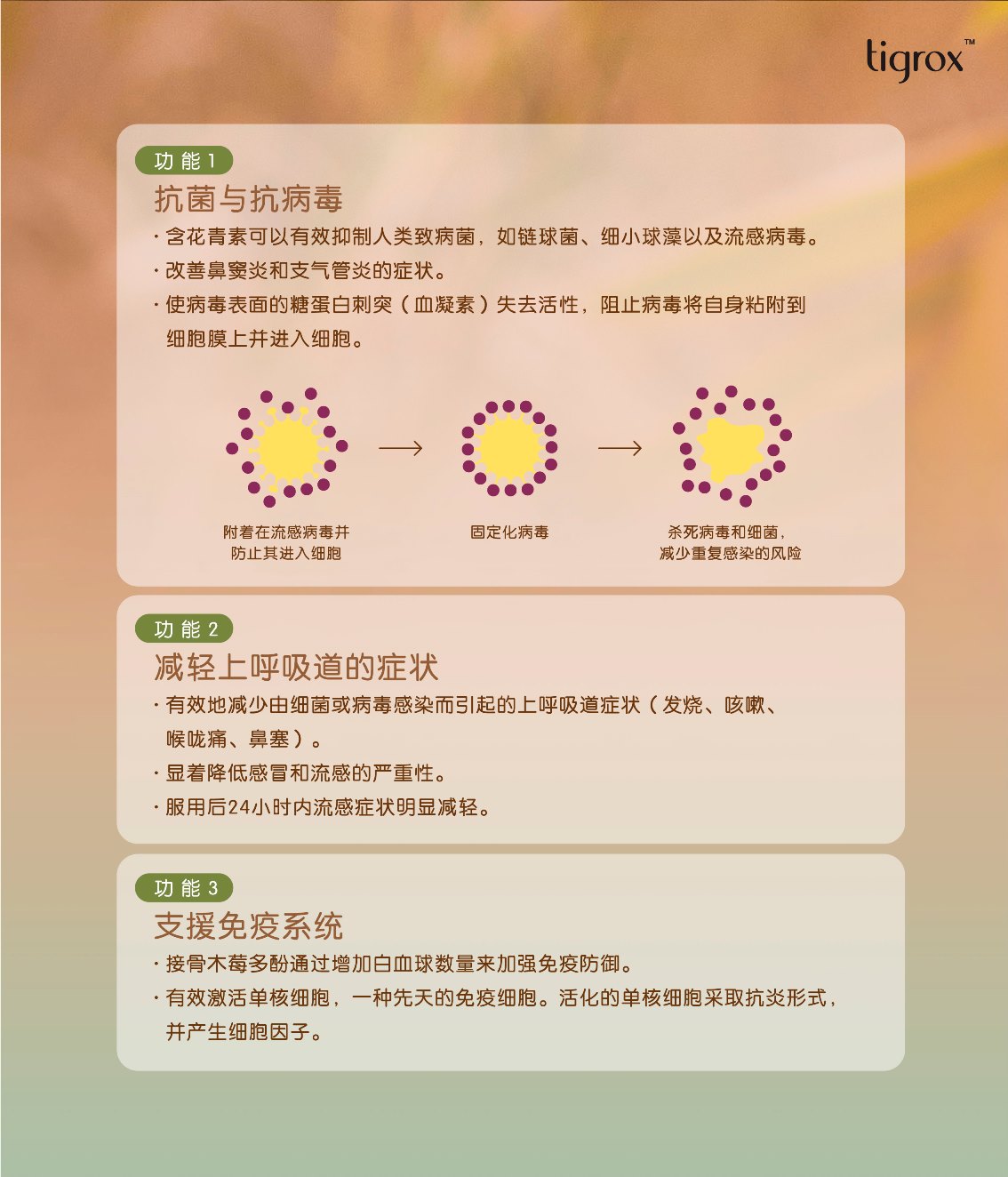 维生素能增强免疫系统功能,并能预防病毒感染。 舞茸菌丝体富含β-葡聚糖,能维持正常细胞功能。 综合果汁富含维生素A和C, 有助于增强免疫力, 减少感冒,改善肠道和消化系统等。