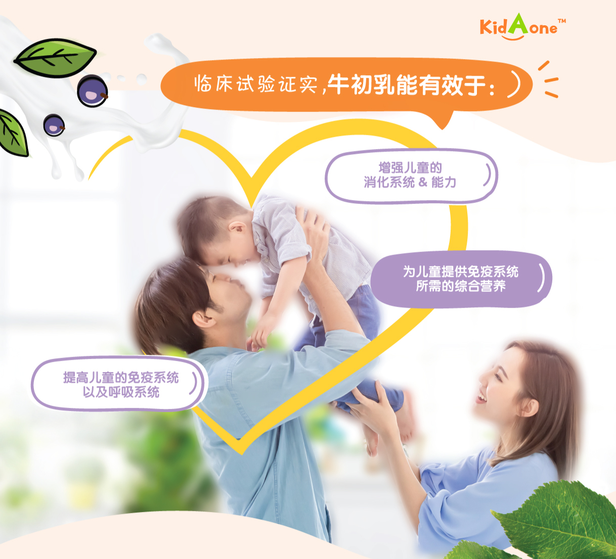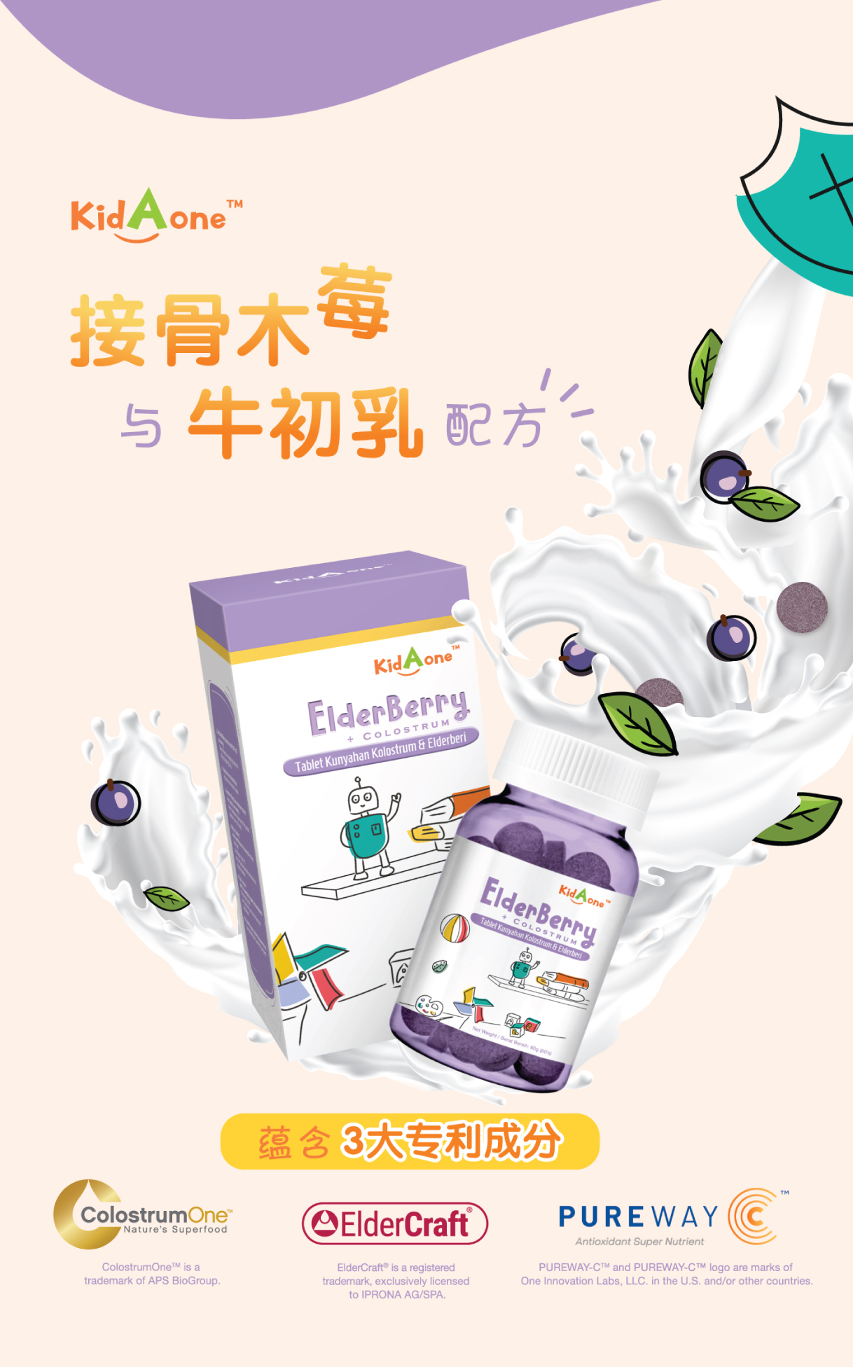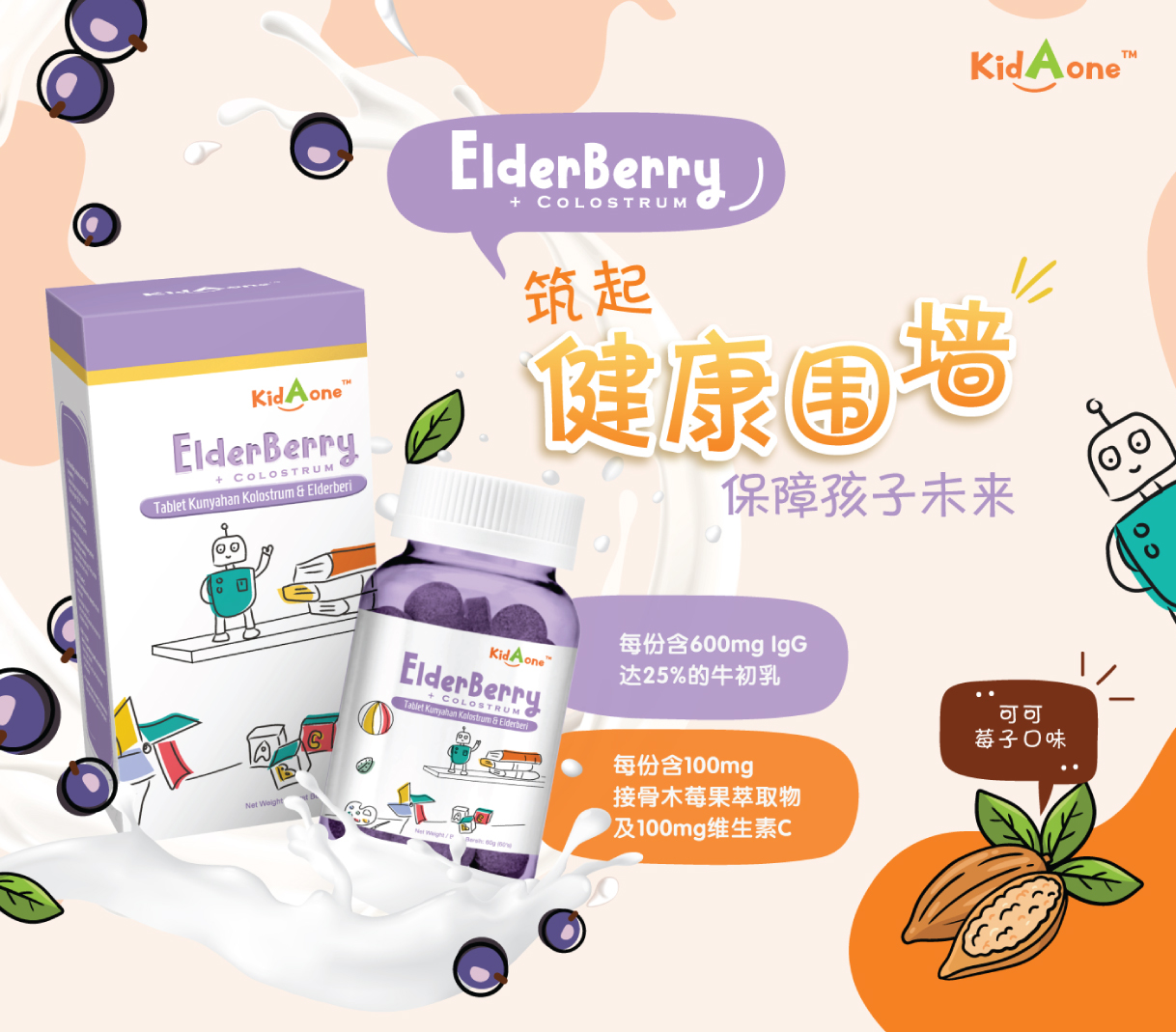 KidAone 是儿童专用配方,提高免疫系统的莓果加可可口味咀嚼片。 当儿童拥有一个健康的免疫系统, 将让他们拥有更强的免疫力和肠胃也更健康。 KidAone 3个主要成分有牛初乳 (ColostrumOne ™), 黑接骨木莓提取物 (ElderCraft ®) 和维生素 C (PUREWAY-C ™)。