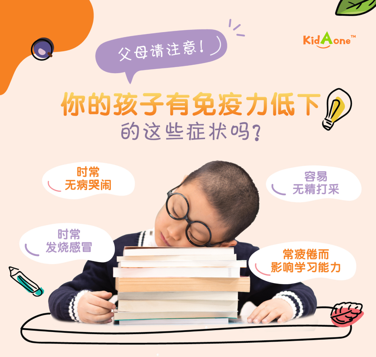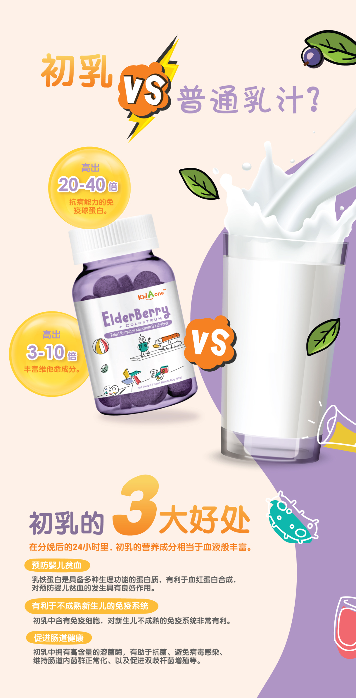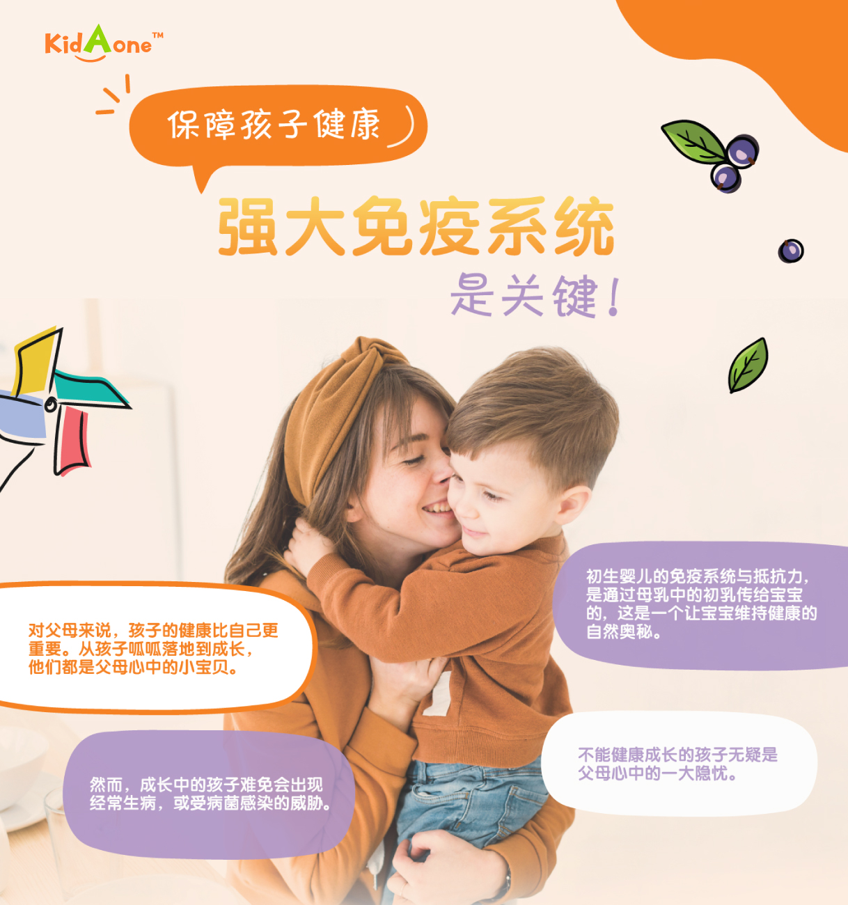 KidAone 是儿童专用配方,提高免疫系统的莓果加可可口味咀嚼片。 当儿童拥有一个健康的免疫系统, 将让他们拥有更强的免疫力和肠胃也更健康。 KidAone 3个主要成分有牛初乳 (ColostrumOne ™), 黑接骨木莓提取物 (ElderCraft ®) 和维生素 C (PUREWAY-C ™)。