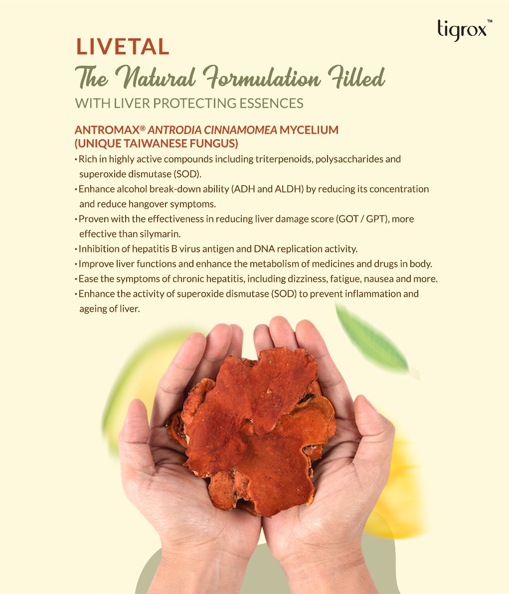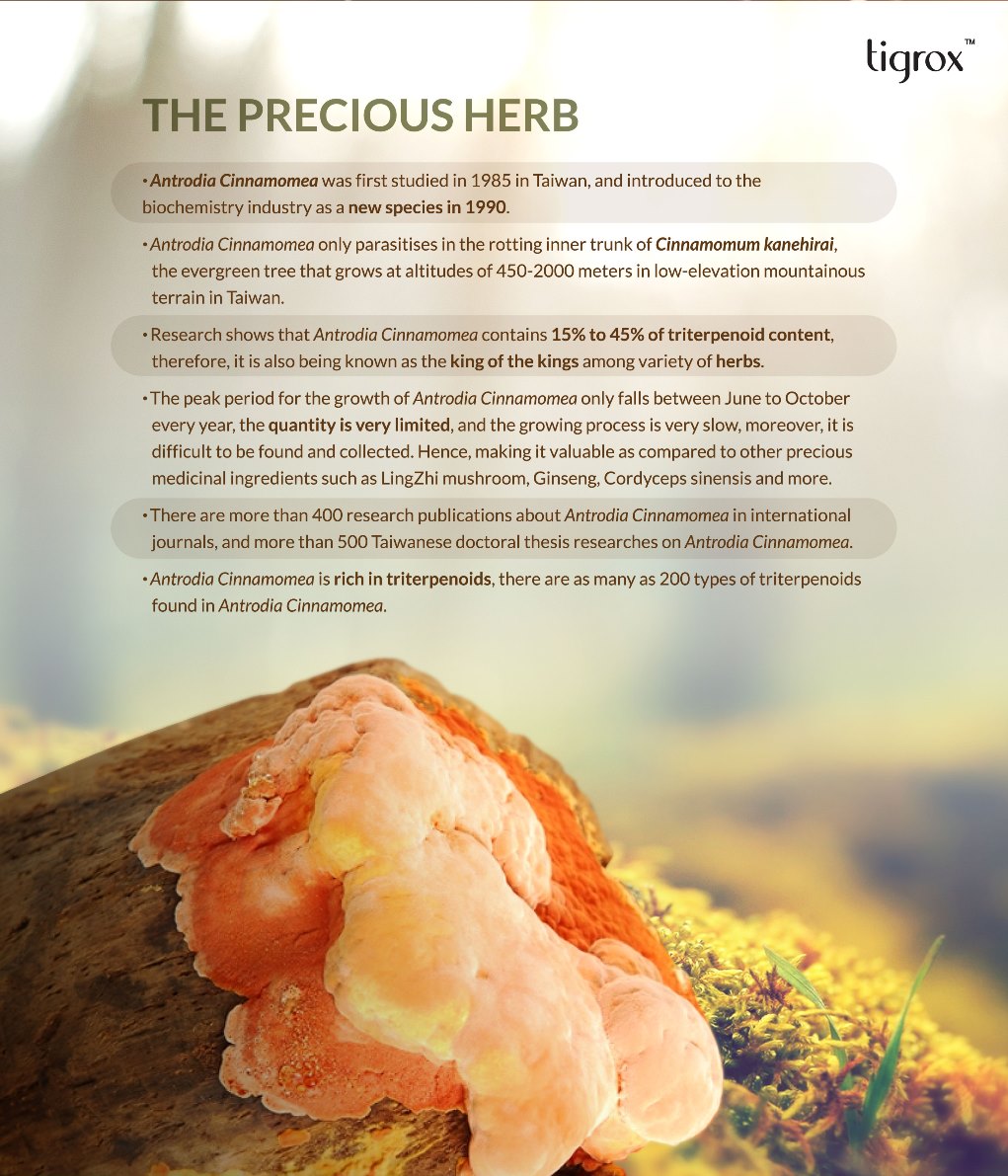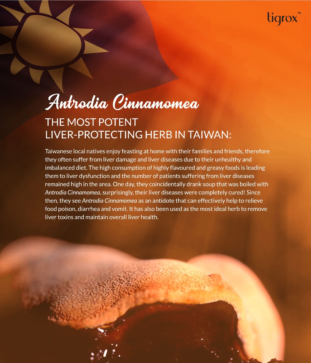 Antrodia Cinnamomea is the rotting inner trunk of Cinnamomum kanehirai. Antrodia Cinnamomea rich in active compounds including triterpenoids, polysaccharides and superoxide dismutase (SOD), it improves liver functions and enhance the metabolism of medicines and drugs in body. It also ease the symptoms of chronic hepatitis, including dizziness, fatigue and more.