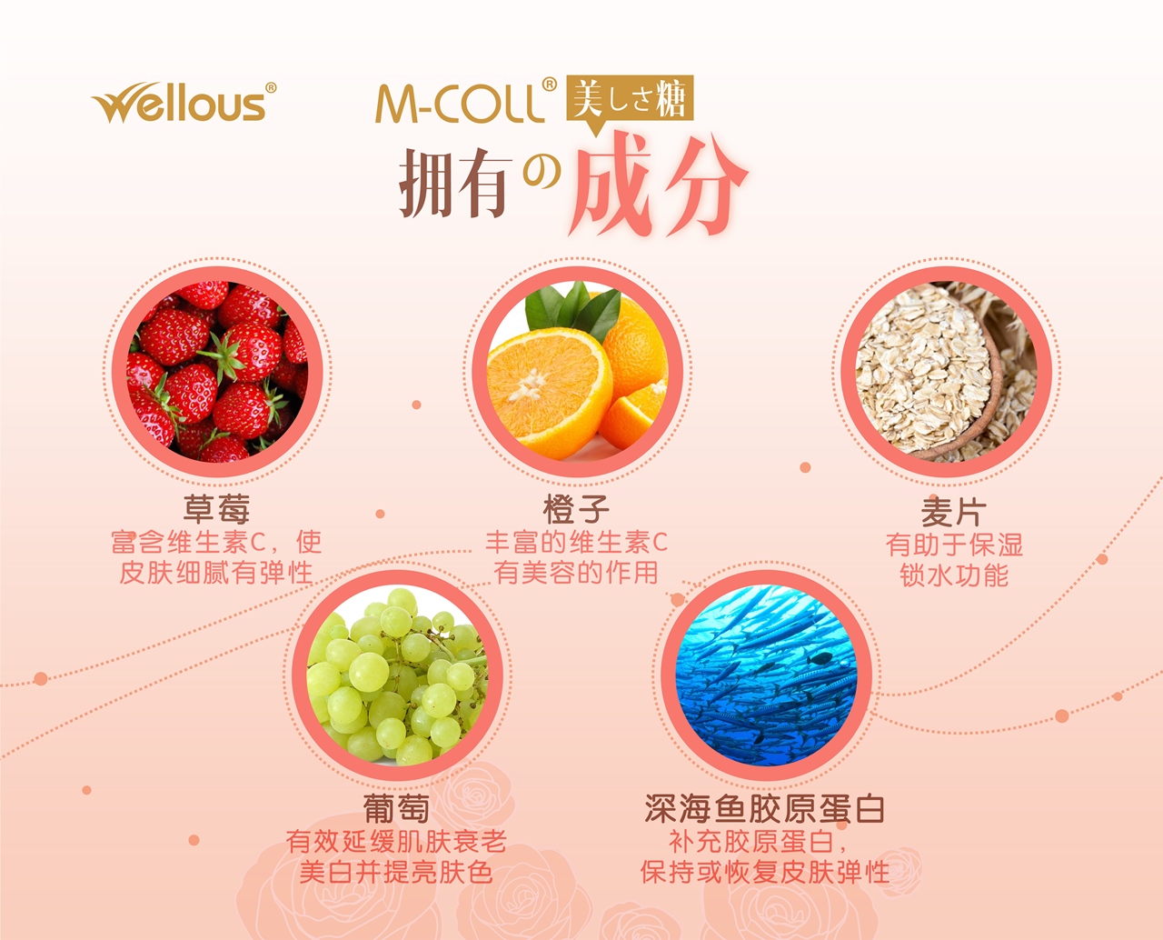M-COLL配方承载了全天然水果成分,例如富含 抗氧化剂的葡萄和橙。