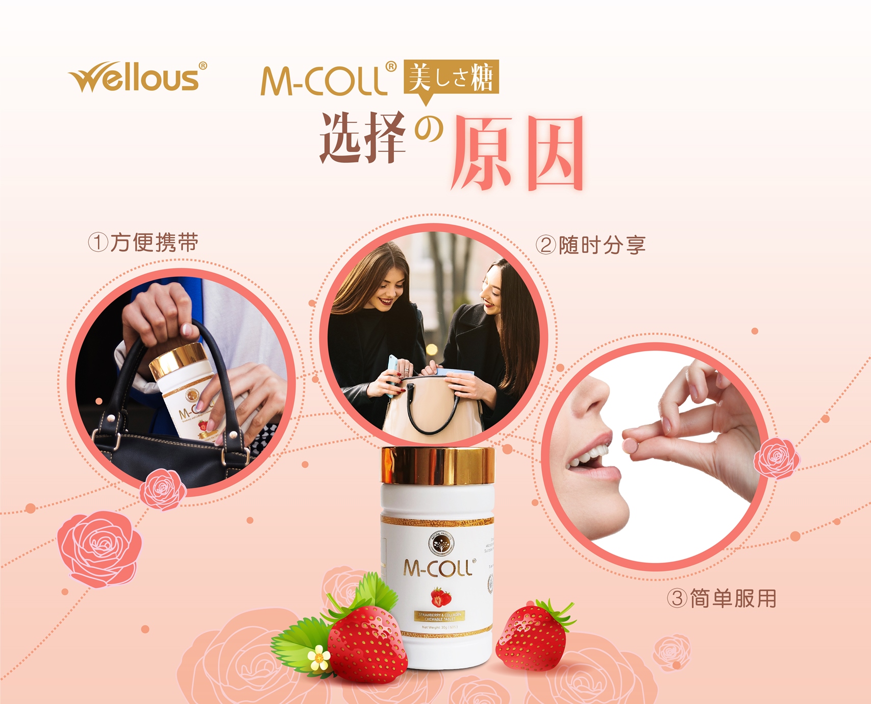 M-COLL蕴含天然的葡萄、橙和草莓成分,这些成分中含有 谷胱甘肽。