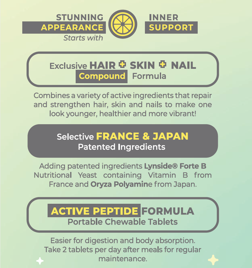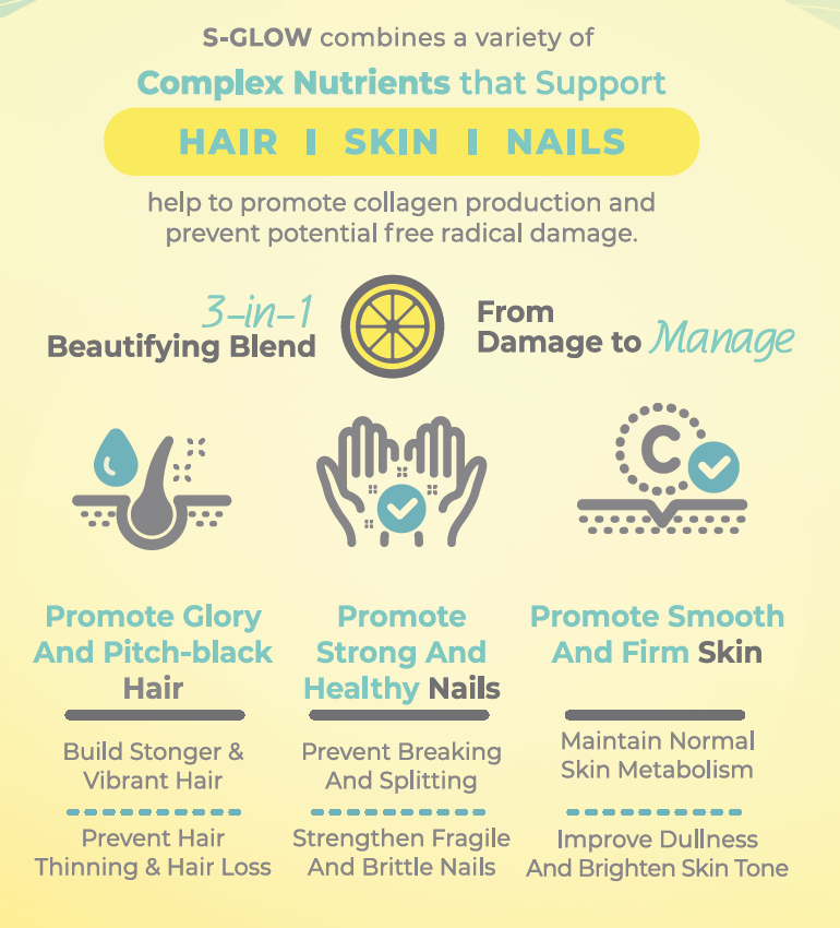 S-GLOW is enriched with patented ingredients that are multifold in functions. For instance, Lynside® Forte B from France is a functional yeast enriched in vitamins to achieve the B complex formula of 8 essential B vitamins which can help to improve the condition of our skin. The wide range of Vitamin B complex namely Vitamin B5 to help promote skin wounds healing, Vitamin B3 that helps improve skin condition, and Vitamin B12 that helps control skin pigment to make it fairer. On top of that, the ingredient can do magic on our nails to stimulate new nail cells to grow. S-GLOW also contains biotin, also known as Vitamin H, which contributes to the health of our hair.
